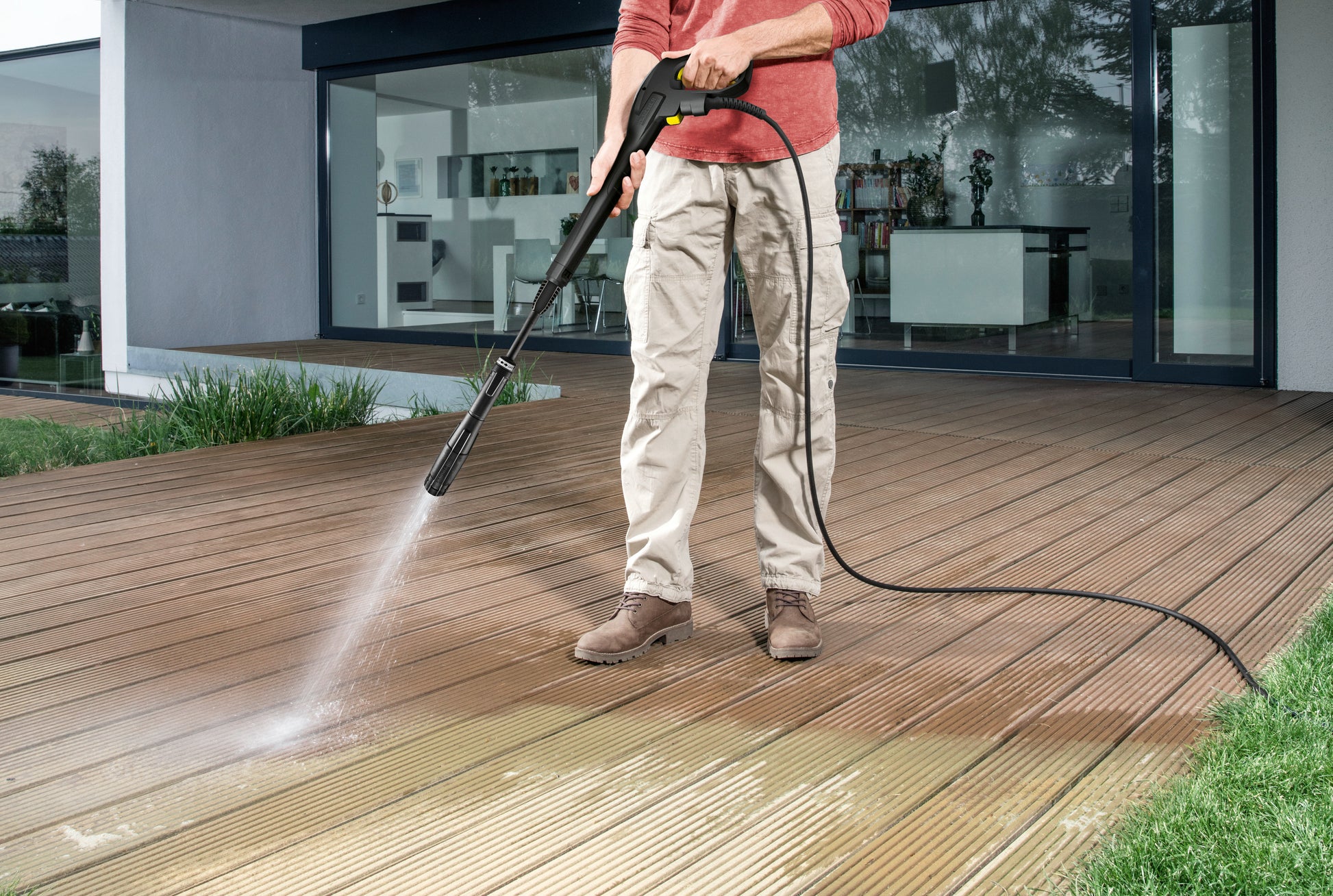 - La manguera de alta presión se engancha y desengancha del equipo y de la pistola de manera rápida y cómoda, lo que ahorra tiempo y trabajo.