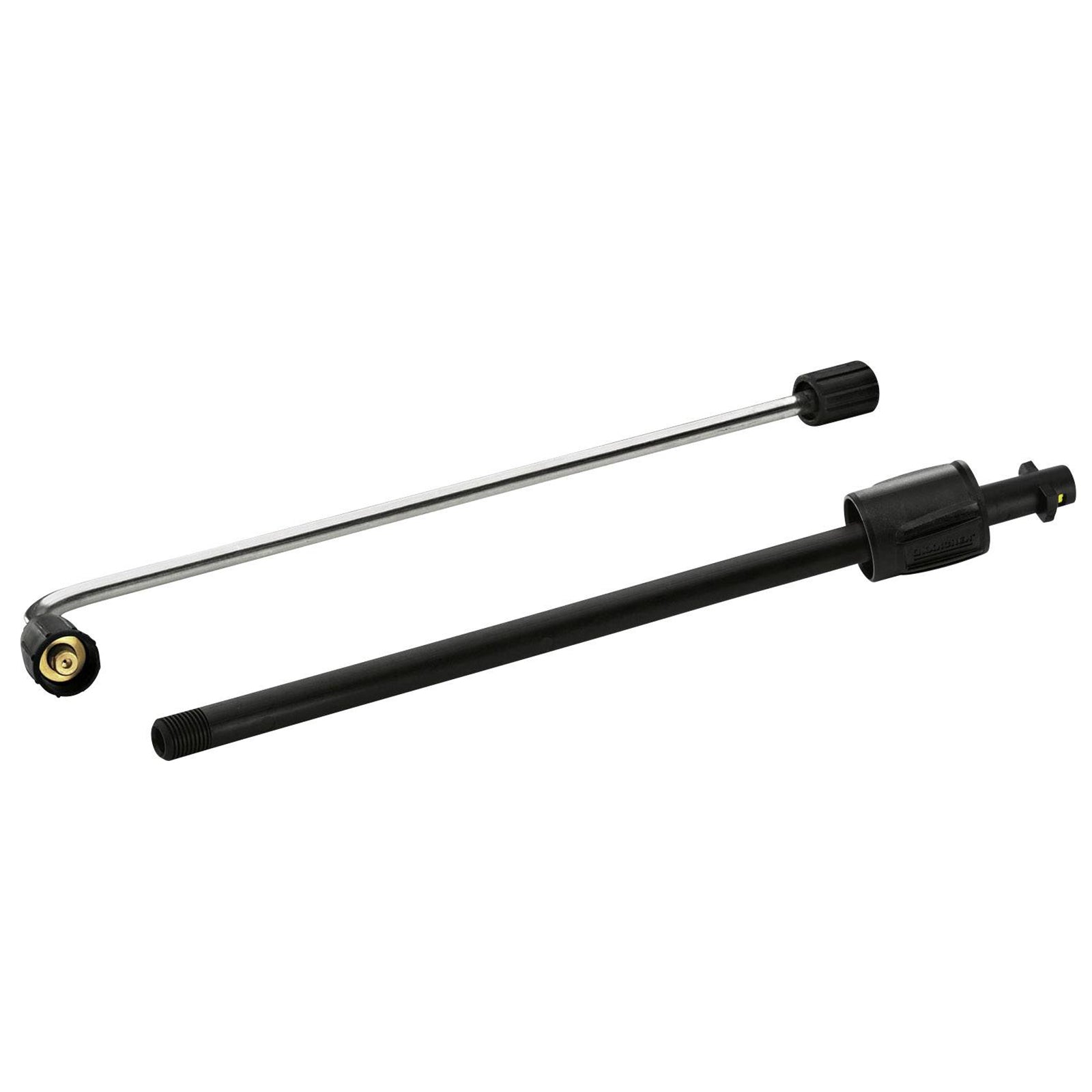 La lanza acodada es un tubo pulverizador acodado extralargo (aprox. 1 m) para limpiar cómodamente puntos de difícil acceso, como por ejemplo canalones de tejados o bajos de vehículos. Adecuada para todas las limpiadoras de alta presión Consumer de Kärcher de las clases K2-K7.