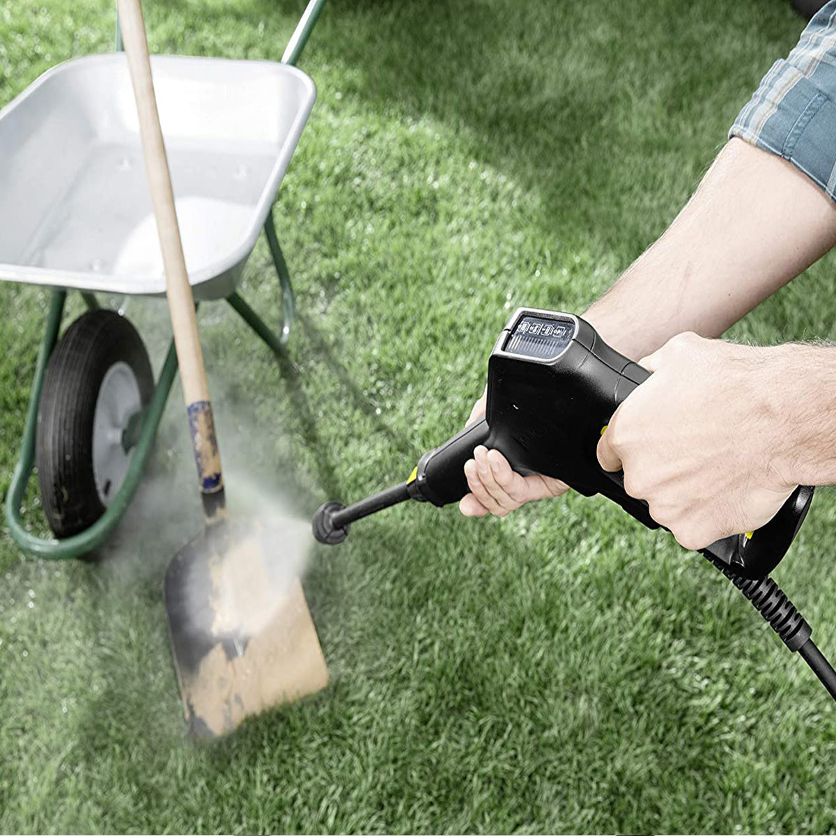 Ajusta el nivel de presión en la lanza pulverizadora y controla la presión en el indicador de la pistola para obtener la máxima monitorización y aplicar la presión ideal en cada superficie. El cambio de alta presión al modo detergente se consigue sin necesidad de cambiar la lanza pulverizadora. Además, la K 3 Full Control de Kärcher convence por un asa telescópica extensible para una colocación y un almacenamiento cómodos, así como por un pie de soporte para facilitar una mayor estabilidad. El pie de soporte puede utilizarse como segunda asa de transporte con la que se puede elevar el equipo con mucha facilidad para colocarlo en un estante o cargarlo en el maletero. Rendimiento de superficie de 25 m²/h.