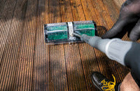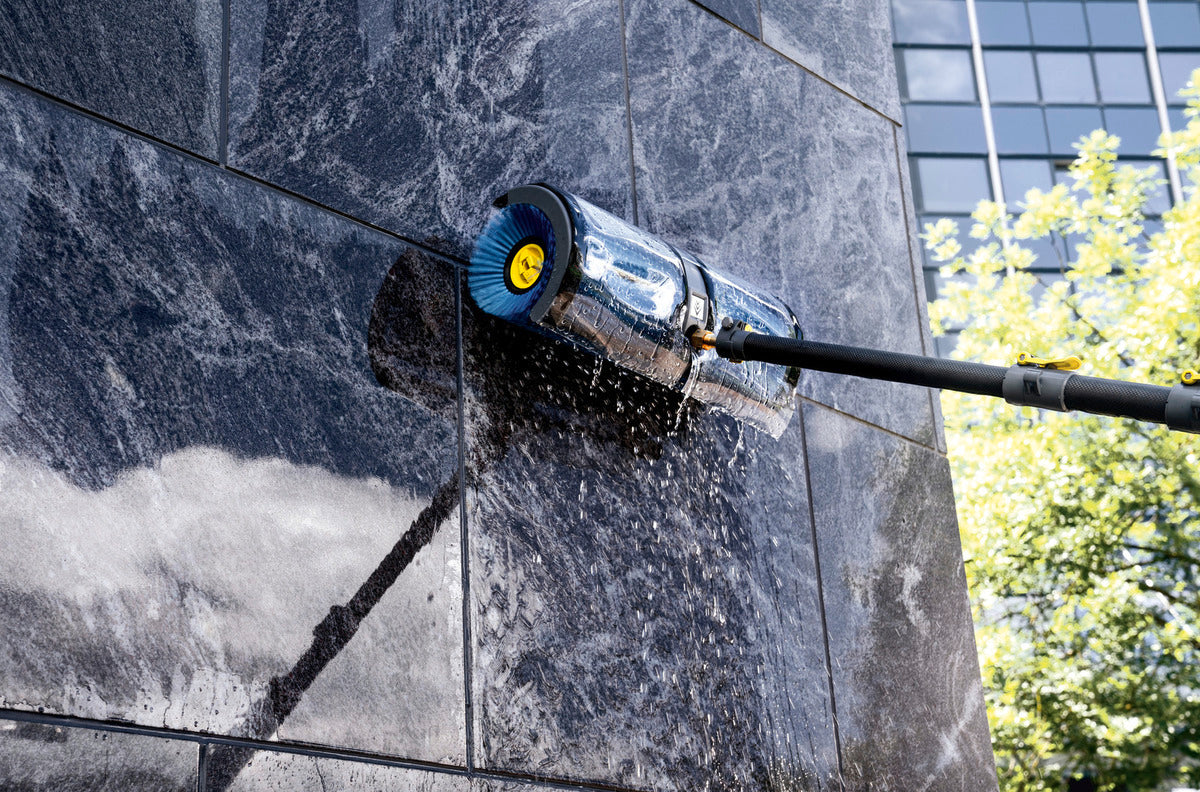 Protección contra salpicaduras con lámina transparente, que se coloca de forma sencilla directamente sobre el accionamiento del cepillo cilíndrico rotativo, permite una visibilidad total sobre el cepillo de limpieza y se cambia fácilmente con la unión de velcro. Además de evitar que el usuario se moje mientras limpia la fachada, la protección contra salpicaduras también permite obtener mejores resultados de limpieza, puesto que el agua se escurre por la fachada arrastrando las partículas de suciedad.